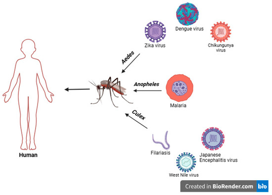 Vectors are bloodsucking arthropods (such as mosquitoes and ticks) capable of acquiring, harboring, and transmitting disease-causing pathogens (such as viruses and parasites) between hosts, including animals and humans. Vector mosquitoes ingest viruses and parasites during the blood meal from the infected host. The pathogen then starts replicating (in the case of arboviruses) or developing into infective stages (in the case of parasites) within the vectors. It is transmitted to a new host with each subsequent bite/blood meal for the rest of their lives [20]. Vector-borne diseases are widespread and are caused by a range of vectors like the Aedes, Culex, and Anopheles species of mosquitoes (Figure 1). According to one of the estimations carried out by the World Health Organization (WHO), more than 700,000 deaths take place every year from vector-borne diseases like malaria, dengue, chikungunya, yellow fever, and zika. The deprived populations are disproportionately affected by these diseases, which are most prevalent in tropical and subtropical regions [21,22]. The repercussions are severe, claiming many lives, and have overwhelmed public health systems in many countries. Diseases like chikungunya, leishmaniasis, and lymphatic filariasis cause long-lasting suffering, lasting morbidity, disability, and societal stigmatization [22]. An intricate set of demographic, societal, and environmental factors play an important role in the spread of vector-borne diseases [23]. Global travel, trade, and unplanned urbanization are other important contributing factors for the spread of vector-borne diseases [22,24].