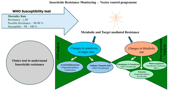 Globally, of the 91 malaria-endemic countries, 62 countries have reported the presence of resistance to at least one class of insecticide, and 50 countries have shown evidence of resistance to two or more classes of insecticides [10]. The failure to mitigate and manage insecticide resistance can lead to increased disease burden and, thus, may potentially reverse the gains and efforts of control programs. Insecticide resistance may alter the vector competence of the vector. This may be due to the expression of genes that are involved in blood feeding and acquiring immunity [11,12,13]. These biological changes can alter the longevity of the vectors [14,15]. Research has shown that insecticide resistance in mosquito vectors is acquired by the presence of two primary mechanisms, increased detoxification of the insecticides by overexpression of inherent detoxification enzymes and through favorable mutations, which result in reduced sensitivity of target sites to applied insecticides (target-site resistance) [16]. Cuticular thickness (penetration resistance) and behavioral avoidance have also been implied for the development of resistance towards insecticides in mosquito vectors [17,18,19]. An inclusive understanding of resistance mechanisms and regulations in vectors needs to be studied carefully. The recent advances in omics can enhance our understanding of associated molecular mechanisms of insecticide resistance in mosquito vectors and facilitate the development of newer insecticides in the future. However, the characterization of phenotypic resistance in vector mosquitoes is essential in the determination of inherent resistance mechanisms related to target-site and metabolic resistance. This review aims to highlight the application of omics towards understanding insecticide resistance in vector mosquitoes.