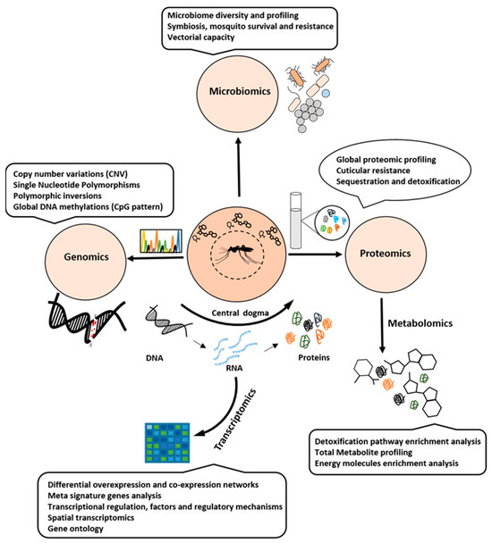 Omics is a vast area referring to the interdisciplinary application of various high-throughput screening technologies to study DNA, RNA, proteins, and metabolites. They are represented by genomics, transcriptomics, proteomics, and metabolomics, respectively. The area of omics has been widely used in identifying several genes and pathways that are crucial for biological processes under various conditions; therefore, omics has high applicability in the field of biotechnology and biomedicine [1,2,3]. The use of omics in vector-borne diseases has been demonstrated for studying conditions like emerging insecticide resistance in vector mosquitoes, host–pathogen interactions, and enhanced susceptibility to various infections [4,5]. There are several genes differentially expressed during vector/pathogen/host interactions and may play important roles in vector competence [6]. Omics approaches can be useful in the characterization of such important biological pathways and processes. Data obtained can eventually help health professionals with the required knowledge to understand the transmission dynamics of vector–pathogen interaction. The emergence of insecticide resistance in mosquito populations is a global problem leading to the resurgence of mosquito-borne diseases [7]. The mosquito vectors develop favorable adaptations and undergo extensive selections under repeated insecticide exposure. This results in the emergence of resistance factors and novel mechanisms in vectors. These resistant mechanisms have been extensively studied and explored [8,9]. In the future, omics can be helpful in decision-making for comprehensive health and wellness assessment in vector-borne diseases and insecticide resistance surveillance programs.