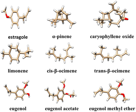 The data presented in Table 1 show that oxygenated monoterpenes are the predominant class of chemicals in tarragon essential oils. Of these, estragole (Figure 1) is the compound found in the highest concentration, regardless of the method used to obtain the tarragon essential oil. Other compounds found in concentrations greater than 1% in at least one of the obtained tarragon essential oils are as follows: cis-β-ocimene, trans-β-ocimene, caryophyllene oxide, limonene, eugenol, eugenol acetate, methyl eugenol ether, and α-pinene (Figure 1). The structural files of these compounds were extracted from the PubChem database [26] and visualized using Chimera1.16 software [27].