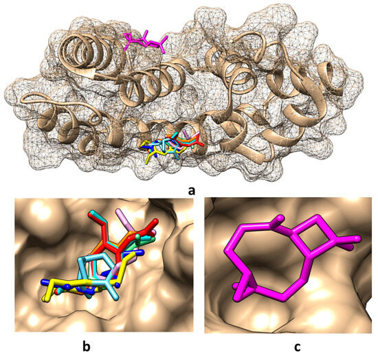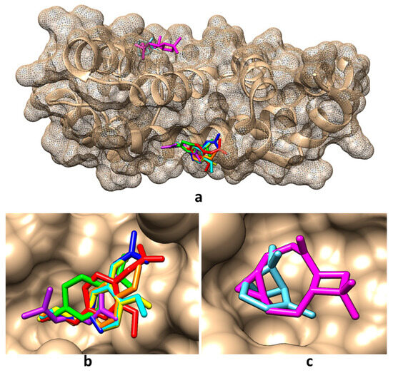 Best binding modes for the main compounds identified in obtained tarragon essential oils to RGS17 protein when using the structural file 1ZV4: (a) overall view; (b) detailed view for binding of α-pinene, cis-β-ocimene, trans-β-ocimene, limonene, estragole, eugenol, eugenol acetate, and eugenol methyl ether; (c) detailed view for binding of caryophyllene oxide. Color representation: α-pinene—light blue, caryophyllene oxide—magenta, cis-β-ocimene—light purple, trans-β-ocimene—dark blue, limonene—light green, estragole—orange, eugenol—yellow, eugenol acetate—red, and eugenol methyl ether—cyan.
