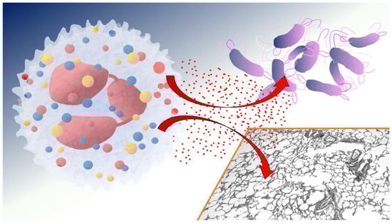 Neutrophil elastases (red points) are released from azurophilic granules of neutrophils during degranulation. It degrades bacterial cell walls (i.e., P. aeruginosa) but also the extracellular matrix components of the host tissue.
