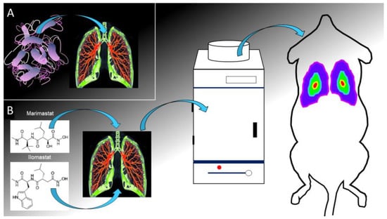 Figure 2. Schematic representation of the experimental protocol used to test marimastat and ilomastat metalloprotease in living small laboratory animals as done in Ref. []. After P. aeruginosa infection of lungs obtained via intratracheal instillation (A), marimastat or ilomastat are administered, via intratracheal instillation, in a mouse model of bioluminescent lung inflammation and the bioluminescent emission is evaluated with an optical imaging instrument (B). A reduction of the luminescence intensity is interpreted as an anti-MMP efficacy.