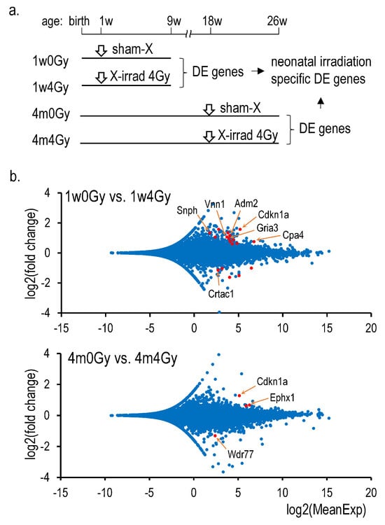 RNA-Seq analysis in the X-irradiated rat thyroid. (a): Schedule of the experiment, (b): MA plots consisting of 18,982 dots (above) and 18,989 dots (below) representing all mapped genes. Red dots indicate differentially expressed genes identified by the DEseq2 analysis, as shown in Supplementary Table S2 (Only Q-RT-PCR-validated gene names were shown).