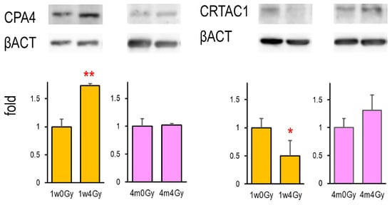 CPA4 and CRTAC1 protein expressions in the thyroid in rats cervically X-irradiated at 1 week and 4 months old. Lysates extracted from the thyroid were examined by Western blot, *, ** indicate significant differences from the control (0 Gy) at p < 0.05 or p < 0.01, respectively. n = 5 (1w0Gy), n = 4 (1w4Gy), n = 4 (4m0Gy), and n = 4 (4m4Gy).