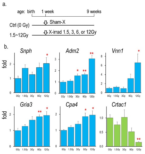 Gene expressions in the thyroid of rats neonatally exposed to various doses of X-rays. (a): Schedule of the experiment [], (b): Thyroidal mRNA levels of rats X-irradiated at 0, 1.5, 3, 6, and 12 Gy, *, ** indicate significant differences from the control (0 Gy) at p < 0.05, or p < 0.01, respectively. n = 6, each group.