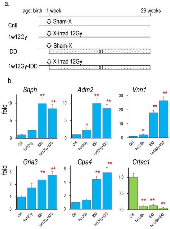 Gene expressions in the thyroid of rats neonatally X-irradiated (1w12Gy), fed with IDD (IDD), or both (1w12Gy-IDD). (a): Schedule of the experiment [], (b): Changes in the identified gene’s mRNA levels in the thyroid relative to the control, *, ** indicate significant differences from the control (0 Gy) at p < 0.05 or p < 0.01, respectively. n = 4 (Cntl), n = 3 (1w12Gy), n = 7 (IDD), and n = 8 (1w12Gy-IDD).