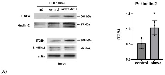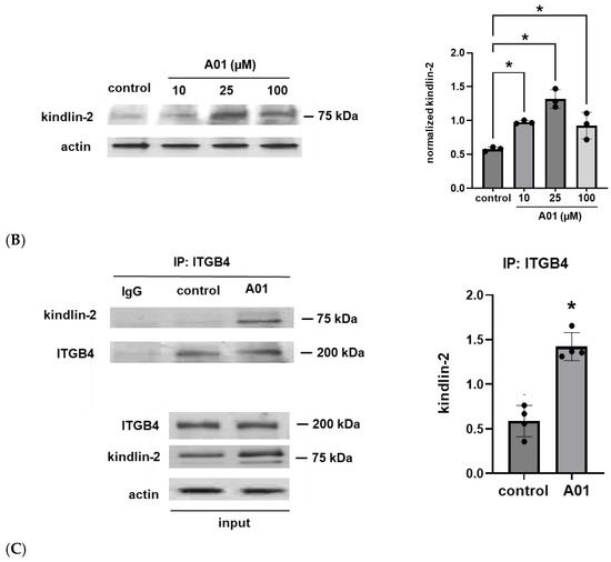 In the initial experiments, human pulmonary artery ECs were treated with simvastatin (5 µM for 16 h) to induce ITGB4 expression as we have previously reported [1]. Cell lysates were then utilized for the immunoprecipitation of kindlin-2 with Western blotting for ITGB4. These experiments demonstrated a significant increase in EC ITGB4:kindlin-2 association induced by simvastatin. Subsequently, ECs were treated with A01, and increased kindlin-2 expression was confirmed by Western blotting with a dose-dependent response noted at lower A01 concentrations (10 and 25 mM) that was not evident at higher concentrations (100 mM). In separate experiments, IP of ITGB4 also confirmed increased ITGB4:kindlin-2 association after A01 treatment (Figure 1).