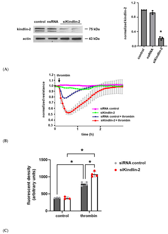 To explore the functional role of kindlin-2 in human lung EC barrier regulation, cells were transfected with siRNA specific for kindlin-2 with silencing confirmed by Western blotting (Figure 2A). Cells were grown to confluence overlying gold-plated microelectrodes and then treated with thrombin (1 U/mL) to induce barrier disruption with EC barrier integrity and then assessed by real-time measurements of transendothelial electrical resistance (TER). These experiments confirmed a significant increase in thrombin-induced barrier disruption with a delayed recovery to baseline in kindlin-2-silenced ECs compared to controls (Figure 2B). In complementary experiments, kindlin-2-silenced ECs were grown in transwell inserts, and FITC-Dextran transwell flux was measured after thrombin stimulation (1 U/mL for 1 h). EC monolayer permeability was significantly increased in kindlin-2-silenced ECs compared to thrombin-stimulated control cells transfected with non-specific siRNA (Figure 2C). Together, these experiments are consistent with the idea that kindlin-2 promotes EC barrier integrity in response to inflammatory stimuli.