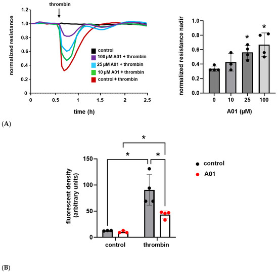 A01 attenuates thrombin-induced EC barrier disruption. (A) Human pulmonary artery ECs were grown to confluence overlying gold-treated microelectrodes and treated with A01 (0–100 µM for 3 d) prior to thrombin (1 U/mL) stimulation with measurements of transendothelial resistance (representative tracing shown; n = 4, * p < 0.05 compared to thrombin-treated controls). (B) Separately, ECs were grown in transwell inserts and treated with A01 (25 µM for 3 d) prior to thrombin (1 U/mL for 1 h) and measurements of FITC–Dextran monolayer flux (n ≥ 3/condition; * p < 0.05).