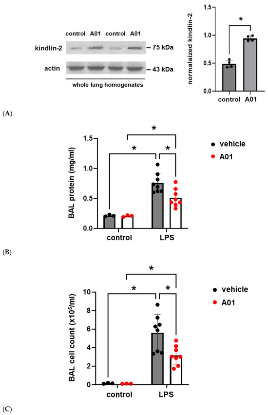 Murine ALI is attenuated by A01: BAL protein and cell counts. Mice were pretreated with A01 (0.1 mg/kg, IP) or vehicle for 48 h prior to repeat treatments under the same conditions, with LPS (1.25 mg/kg) given by intratracheal administration 1 h later to induce ALI. At 24 h after LPS, the animals were sacrificed, and BAL fluid was collected for measurements of the total protein and inflammatory cells, which are indices of lung injury. (A) Whole lung homogenates from control and A01-treated mice were subjected to Western blotting for kindlin-2 (representative blots shown; n = 4/condition; * p < 0.05). Separately, BAL fluid was used to measure (B) total protein and (C) cell counts (n ≥ 3/condition; * p < 0.05).