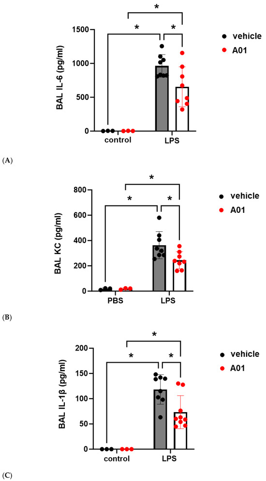 Murine ALI is attenuated by A01: BAL cytokines. Mice were pretreated with A01 (0.1 mg/kg, IP) or vehicle for 48 h prior to repeat treatments of the same for each animal, with LPS (1.25 mg/kg) given by intratracheal administration 1 h later to induce ALI. At 24 h after LPS, the animals were sacrificed, and BAL fluid was collected to measure cytokine levels, (A) IL-6, (B) KC, and (C) IL-1β, which are indices of inflammation (n ≥ 3/condition; * p < 0.05).