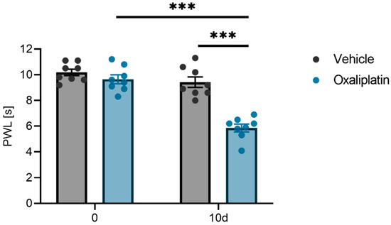 Mechanical pain thresholds of wild-type BL/6 mice before and 10 days after an i.p. injection of oxaliplatin (3 mg/kg) compared to a vehicle (0.9% v/v DMSO) using a dynamic plantar test. Shown is the mean ± SEM of the paw withdrawal latency (PWL) of n = 8 mice per group: *** p < 0.001 (two-way ANOVA with Bonferroni post-hoc test).