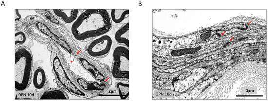 (A) Electron micrograph showing myelinated (arrowheads) and nonmyelinated (asterisks) nerves of an OPN mouse with numerous mitochondria in the axons (arrows). All the axons looked similar to their controls. (B) Axon diameters of myelinated and nonmyelinated nerves in OPN mice compared to controls, ctrl (n = 6, OPN n = 3). (C) Number of mitochondria per axon. The statistic is the mean ± SEM, and the points represent the mean values of individual animals: ns = not significant; * p < 0.05; *** p < 0.001 (t-test).