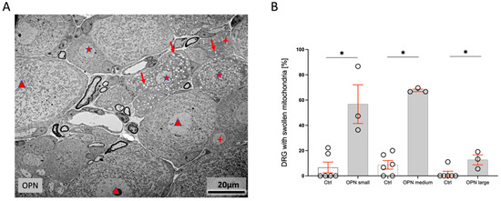 (A) Transmission electron micrograph of small (crosses), medium-sized (asterisks), and large (arrowheads) DRG neuronal cells in an OPN mouse. The large neuronal cells looked normal, and a proportion of the small and medium-sized mitochondria had swollen mitochondria (arrows). (B) Quantification of the percentage of small, medium-sized, and large neuronal cells with swollen mitochondria (ctrl, n = 6, OPN n = 3). The statistic is the mean + SEM of small (<300 µm2), medium (300–700 µm2), and large (>700 µm2) perikarya [%]; * p < 0.05 (t-test).