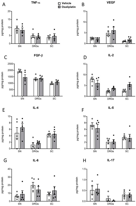 Concentrations of inflammatory growth factors and cytokines in nervous tissue of vehicle-treated (white bars) or oxaliplatin-treated (grey bars, 3 mg kg−1) mice. Tissue was collected ten days after the treatment. Shown are the concentrations of TNF-α (A), VEGF (B), FGF-β (C), IL-2 (D), IL-4 (E), IL-5 (F), IL-6 (G), and IL-17 (H) in the sciatic nerve (SN), dorsal root ganglia (DRG), and dorsal spinal cord (SC). Not detected were IL-1a, IL-1b, IL10, and IL-12. Shown are the results from n = 5 mice per group, measured in technical duplicate. The raw data were normalized to the total protein amount of the sample.