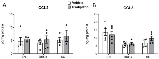 Likewise, concentrations of the chemokines CC-chemokine ligands 2 and 3 (CCL2 and CCL3) were analyzed in the nervous tissue of oxaliplatin- and vehicle-treated mice and did not reveal any differences between the treatment groups (Figure 6).