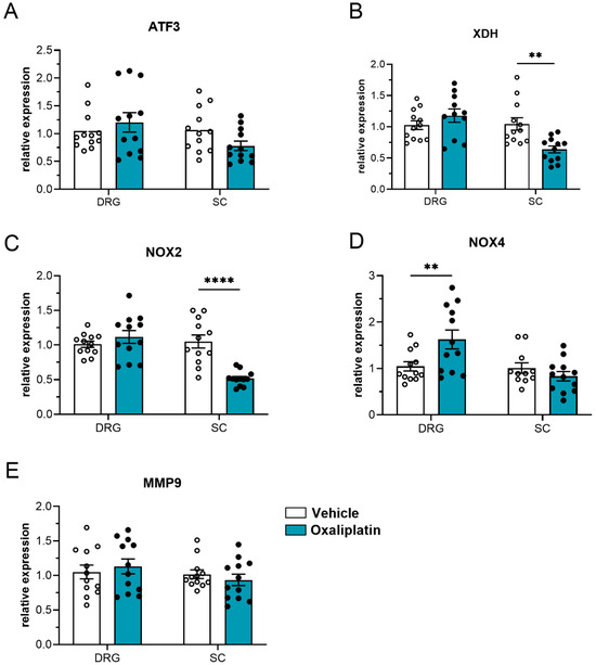 However, differences in the expression of different neuronal and oxidative stress markers of oxaliplatin- and vehicle-treated animals were observed in the dorsal root ganglia and spinal cord. We assessed the expression of the neuronal stress markers activating transcription factor 3 and matrix metallopeptidase 9, as well as the oxidative stress markers NADPH oxidase 2 (NOX 2), NADPH oxidase 4 (NOX 4), and xanthine dehydrogenase, ten days after treatment (Figure 7). Based on this, we observed a significant decrease in both xanthine dehydrogenase (Figure 7B) and NOX 2 in the spinal cord of oxaliplatin-treated animals compared to vehicle-treated animals. In contrast, we observed an increase in the expression of NOX 4 in the dorsal root ganglia.