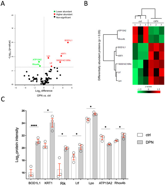 Proteomic analysis of tear film of oxaliplatin-treated mice (OPN, 8–10 d) compared with control animals (ctrl, 8–10 d), measured by LC-MS/MS; n(OPN/ctrl) = 3 animals/group. (A) Volcano plot and (B) heat map illustrating the seven significantly differentially abundant tear proteins in OPN compared to the ctrl. (C) Bar graph of log2 intensity of OPN and the ctrl. Bars represent the mean ± SEM, * p < 0.05, **** p < 0.001 (Student’s two-sided t-test).