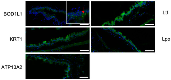 Immunohistochemical detection (green) of Bod1l (red arrow), Atp13a2, Lpo, LTF, and Krt1 in the conjunctiva of wild-type mice. Nuclei are visible with DAPI (blue); scale bar: 50 µm.