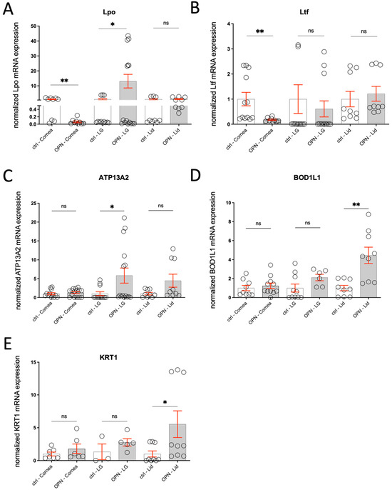 Diagrams showing the differences in gene expression in OPN animals (n = 3–7) of (A) Lpo, (B) Ltf, (C) ATP13A2, (D) BOD1L1, and (E) KRT1 in the cornea, lacrimal gland, and eye lid. The statistic is the mean + SEM relative to the mean of the control (n = 3–5); * p < 0.05, ** p < 0.01, ns = not significant (t-test).