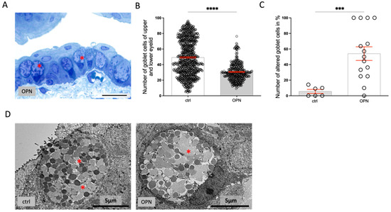 (A) A 1 μm section through the conjunctiva with altered goblet cells (asterisks); scale bar: 20 µm. (B) A significant decrease in the number of goblet cells counted in serial sections through the conjunctiva (230 sections/lid) and (C) the percentage of goblet cells per histological section ((ctrl) = 6, n (OPN) = 15) showing changes in apical vesicles. (D) Electron micrographs of a control (ctrl) and 10-day-treated OPN goblet cell with fused apical secretory vesicles (asterisks). The statistic is the mean + SEM; *** p < 0.001, **** p < 0.0001 (t-test).