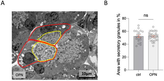 (A) Transmission electron micrograph of an endpiece of the lacrimal gland (cells with nuclei in the section marked in red). The apical area containing secretory vesicles is marked in yellow. (B) Diagram showing that the percentage of the area with secretory vesicles is not changed in OPN mice compared to the controls. The statistic is the mean + SEM; ns = not significant (t-test).