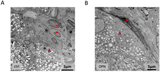 The meibomian gland cells of Ox-treated mice looked normal, but there were changes in the surrounding connective tissue (CT) and the basement membrane (BM) of the gland (Figure 13). The BM was thickened in some places. In the CT of treated mice, there were elongated smooth muscle cells that followed the course of the basal cells of the gland (Figure 13A). These cells showed an increase in rER and a densification of the myofilaments, which is a sign of a stress reaction (Figure 13B).