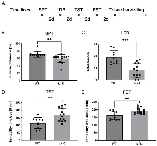 The present study found that IL-33-overexpressing mice showed an 18.15% longer immobilization time in the FST and a 47.03% longer time in the TST compared to WT mice. In the SPT, IL-33-overexpressing mice had a 16.54% lower preference for sugar water than WT mice, suggesting they exhibit depression-like behavior. This finding is consistent with the results of previous studies showing that the IL-33 concentration in the cerebrospinal fluid was significantly associated with the development of perinatal depression [