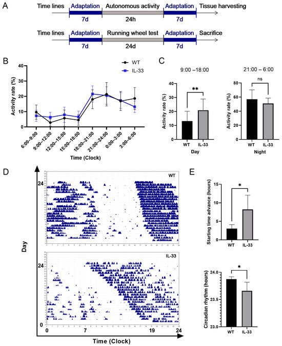 Table 1). Only BMAL2 mRNA levels increased at night, while no significant differences were found in other core clock genes when compared to wild-type (WT) mice. Under 12 h of light/12 h of darkness, IL-33-overexpressing mice exhibited peak activity time periods from 18:00 to 21:00, earlier than those observed in WT mice. In the course of running-wheel experiments, a shortening of circadian rhythms was observed in IL-33-overexpressing mice. This finding correlates with increased expression of Clock in the hippocampus, which has been shown to lengthen circadian rhythms after Clock gene mutation [