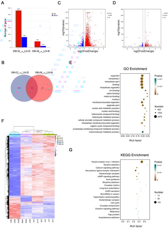 There were three mice per group for transcriptomic sequencing. Total RNA was isolated from the hippocampus using TRIzol Reagent (Invitrogen Life Technologies, Waltham, MA, USA), after which its concentration, quality, and integrity were determined using a NanoDrop spectrophotometer (Thermo Scientific, Waltham, MA, USA). Three micrograms of RNA were used as the input material for the RNA sample preparations. To generate sequencing libraries, mRNA was first purified from total RNA using poly-T oligo-attached magnetic beads. Fragmentation was performed using divalent cations at elevated temperatures in an Illumina proprietary fragmentation buffer. First-strand cDNA was synthesized using random oligonucleotides and SuperScript II. Second-strand cDNA synthesis was performed using DNA Polymerase I and RNase H. The remaining overhangs were converted into blunt ends via exonuclease/polymerase activity, and the enzymes were removed. After adenylation of the 3′ ends of the DNA fragments, Illumina PE adapter oligonucleotides were ligated for hybridization. To select cDNA fragments of the preferred 400–500 bp in length, the library fragments were purified using the AMPure XP system (Beckman Colter, Beverly, CA, USA). DNA fragments with ligated adaptor molecules at both ends were selectively enriched using Illumina PCR Primer Cocktail in a 15-cycle PCR reaction. Products were purified (AMPure XP system, Waltham, MA, USA) and then quantified using the Agilent high-sensitivity DNA assay on a Bioanalyzer 2100 system (Agilent, Santa Clara, CA, USA). Subsequently, the sequencing library was sequenced on a NovaSeq 6000 platform (Illumina), Shanghai Personal Biotechnology Co., Ltd. (Shanghai, China).