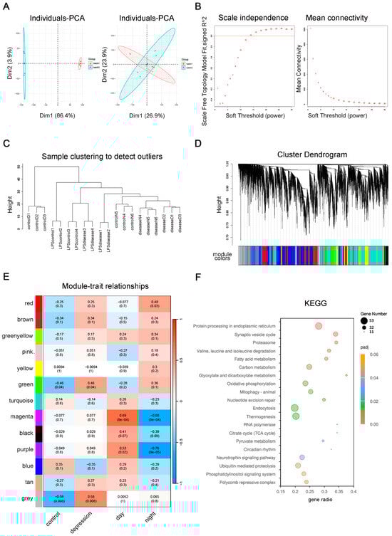 2 > 0.8 was used as a criterion to determine the soft threshold β. The appropriate soft threshold was calculated and then weighed, and the adjacency matrix of the expression spectrum was constructed. The adjacency matrix was then converted to a topological overlap matrix (TOM) according to the TOM overlap computation formula, and a threshold value of 0.25 was used to merge similar modules. Next, the relationship between each gene module and the sample phenotype was calculated, and Pearson correlation analysis was used to determine the correlation between the gene modules and the depressed mice and circadian rhythm scores to identify the gene modules that were most strongly correlated with both depression and circadian rhythms.