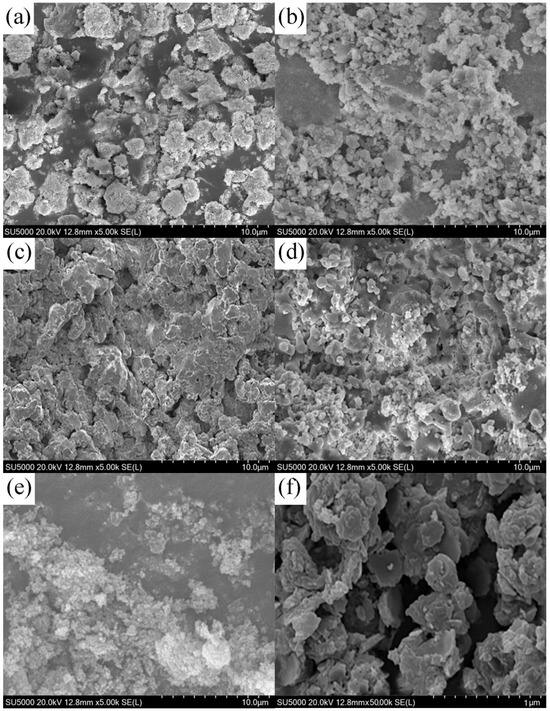 SEM images of nano-sized MgO at different target temperatures: (a) 300 °C, (b) 400 °C, (c) 500 °C, (d) 600 °C, and (e) 700 °C, and (f) magnified image of 500 °C.