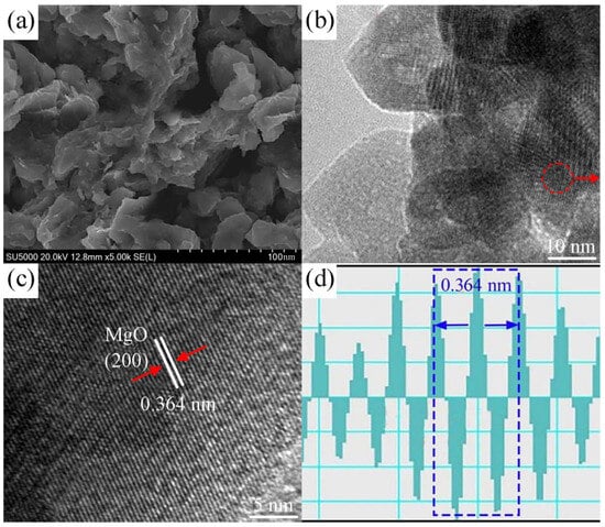 Figure 2 illustrates the microstructure of the nano-sized MgO calcined at 500 °C. Figure 2a shows an SEM image of the MgO particles with a rough and porous surface morphology. Figure 2b presents a TEM image revealing the internal structure of the particles, including nanoscale crystalline domains. Figure 2c shows a high-resolution TEM (HRTEM) image, highlighting clear lattice fringes with an interplanar spacing of 0.364 nm, corresponding to the (200) plane of MgO. Figure 2d provides a detailed analysis of the lattice spacing, confirming the 0.364 nm distance between the fringes. The TEM and HRTEM images reveal well-resolved lattice fringes, indicating high crystallinity []. The lattice spacing of 0.364 nm corresponds to the (200) plane of MgO, confirming successful crystalline formation. The combination of porosity and crystallinity at this temperature is crucial for optimizing the material’s adsorptive and catalytic properties.