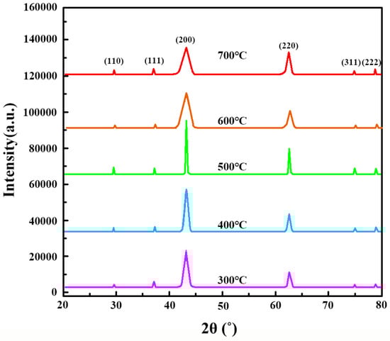The XRD patterns (Figure 3) of MgO calcined at 300 °C, 400 °C, 500 °C, 600 °C, and 700 °C reveal diffraction peaks corresponding to the (110), (111), (200), (220), (311), and (222) crystal planes of MgO []. While the sample calcined at 500 °C showed distinct diffraction peaks, the relative intensities across the samples indicate that all the calcined materials share the same phase structure. To evaluate crystallinity more reliably, peak broadening was analyzed using the Scherrer equation, focusing on the (200) peak as a representative reflection. A zoomed-in view of the (200) peak is provided in Figure 3, revealing broader peaks for the 500 °C sample compared to those calcined at higher temperatures, suggesting smaller crystallite sizes. The calculated crystallite sizes based on the (200) peak are summarized in Table 1. These results demonstrate that the 500 °C calcined sample exhibits relatively smaller crystallite sizes, contributing to its optimized porosity and adsorption properties. Lower calcination temperatures (300 °C and 400 °C) resulted in incomplete phase formation, whereas higher temperatures (600 °C and 700 °C) led to sintering effects, reducing the surface area and structural integrity. This comprehensive analysis aligns with the SEM and TEM observations, confirming that 500 °C is the optimal calcination temperature for achieving a balance between crystallinity and porosity.