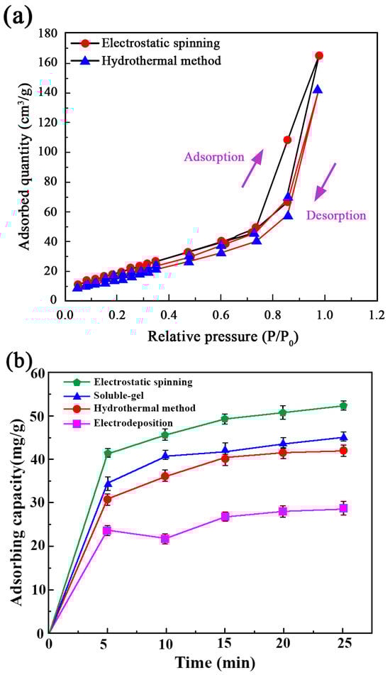 To further evaluate the adsorption capability of nano-sized MgO fibers, nitrogen adsorption–desorption isotherms were obtained using BET analysis. Figure 4a presents the nitrogen adsorption–desorption isotherms for MgO synthesized by two different methods: electrospinning and hydrothermal synthesis. The isotherms exhibit a characteristic Type IV behavior with an H3 hysteresis loop, indicative of mesoporous materials. This suggests the presence of slit-shaped pores and a well-developed porous structure, which is crucial for effective adsorption performance.