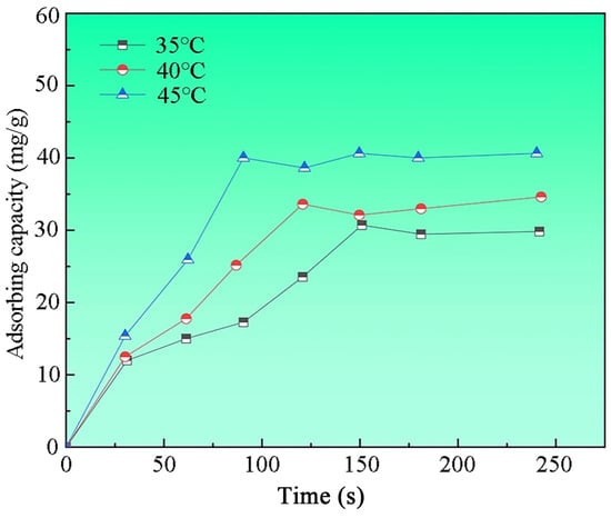 A 1000 mL solution of 30 mg/L MB was prepared, and 30 mL of this solution was transferred into six centrifuge tubes. Each tube was treated with 10 mg of nano-sized MgO fibers and oscillated at 35 °C and 260 r/min for 3 h. After reaching the designated time, the solution was centrifuged at 3600 r/min for 5 min. The absorbance before and after oscillation was measured using a UV-VIS spectrophotometer to calculate the removal rate []. Adsorption experiments at 40 °C and 45 °C followed the same procedure, except for the temperature setting. The removal efficiency results are presented in Figure 6. At 35 °C, the adsorption efficiency increased proportionally with time in the initial stage, reaching its peak at 150 min, after which equilibrium was established. At 40 °C, the efficiency also increased over time, with the maximum adsorption and equilibrium occurring at 120 min. At 45 °C, equilibrium was achieved more quickly, within 90 min, with the adsorption capacity nearing 40 mg/g. The overall analysis indicates that higher temperatures accelerate the adsorption process, leading to quicker equilibrium and enhanced MB removal efficiency.