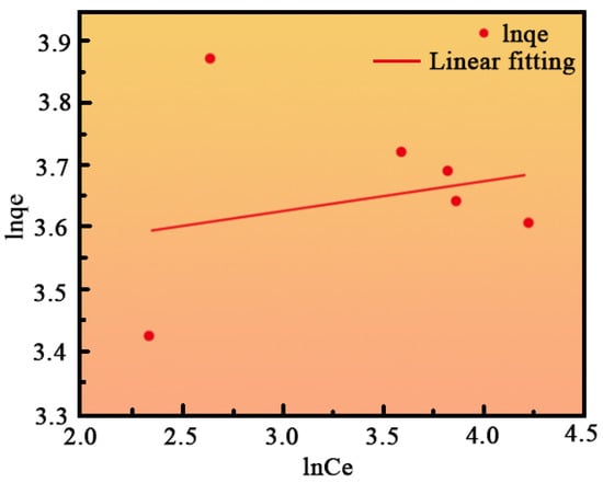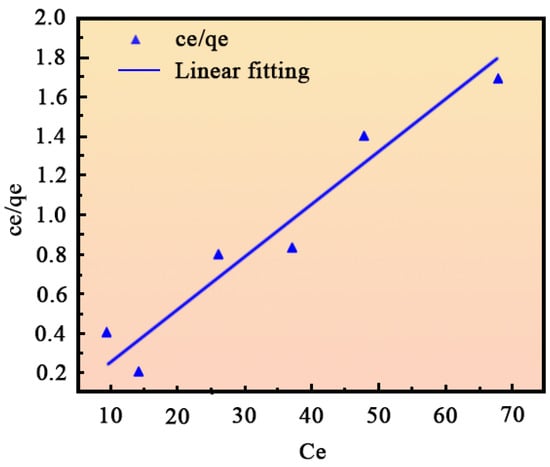 The adsorption isotherm represents the relationship between temperature, concentration, and adsorption capacity. To describe the adsorption behavior of methylene blue on the surface of magnesium oxide fibers, the experimental data were fitted using both the Langmuir and Freundlich isotherm models. The Langmuir isotherm equation is represented by Equation (3), while the Freundlich isotherm equation is shown in Equation (4):