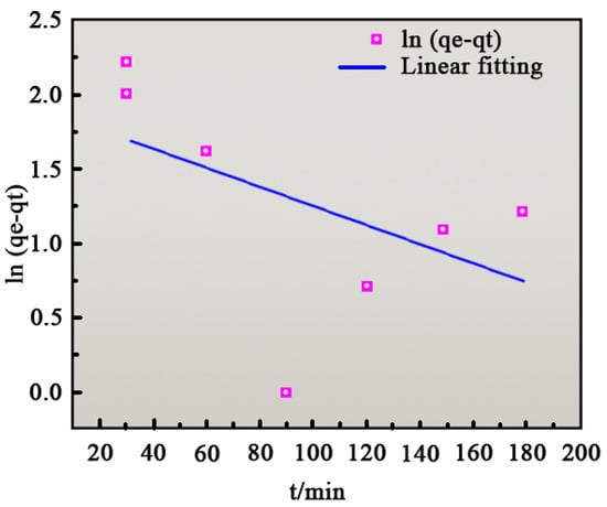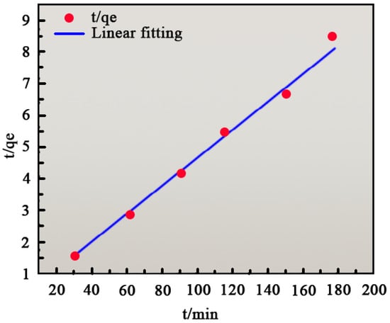 where qt is the adsorption amount at the adsorption time t (mg/g), t is the adsorption time (min), k1 is the primary kinetic adsorption constant (min−1), and k2 is the primary kinetic adsorption constant (g/mg·min−1).