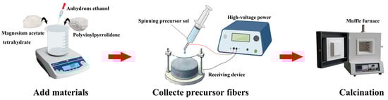 Schematic diagram of the electrospinning process for the preparation of nano-sized magnesium oxide (MgO).
