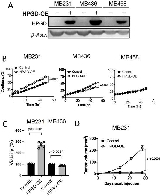 To investigate the role of 15-hydroxyprostaglandin dehydrogenase (HPGD) in regulating cell proliferation and tumor growth, we stably transduced three human triple-negative breast cancer (TNBC) cell lines—MDA-MB231, MDA-MB436, and MDA-MB468—with lentiviral vectors carrying HPGD. Successful transduction was selected using puromycin (2 μg/mL) for 10 days. Western blot analysis confirmed the overexpression of HPGD in all three cell lines, with levels significantly higher than those in control cells (Figure 1A, Supplementary Figure S1A).