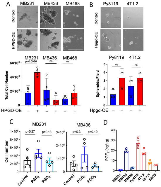 HPGD regulates spheroid formation of TNBC cells in a cell line-dependent manner. (A,B) Representative images of spheroid formation and total cell numbers from spheroids of human cell lines (A) and murine cell lines (B) expressing ectopic HPGD and cultured in 3D mammosphere media for 7–10 days. The scale bar is 300 μm. (C) Total cell numbers from spheroids of MB231 and MB436 cells treated with exogenous PGE2 or PGD2 in 3D mammosphere media for 10 days (n = 4 biological replicates). (D) Endogenous PGE2 levels of human and murine TNBC cells. PGE2 levels normalized to whole cell protein concentration (n = 3 technical replicates). Data are mean ± SD for (A,B), or mean ± SEM for (C,D). p-values using a two-tailed Student’s t-test. ns indicates not significant (p > 0.05).