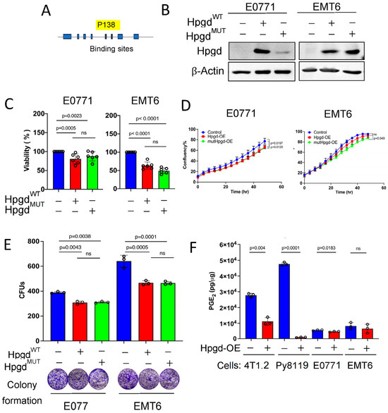 To determine whether the non-canonical functions of HPGD are critical for tumorigenesis independent of PGE2 levels, we generated a mutation in the PGE2-binding domain of Hpgd (Figure 4A). Given that exogenous PGE2 supplementation did not affect spheroid formation of human TNBC cells, we focused on mutating murine Hpgd for expression in murine TNBC cells. A proline (P) to alanine (A) substitution at position 138 (P138A) in the catalytic domain of Hpgd was introduced, which abolishes PGE2 binding and enzymatic activity [16]. We then constructed stable cell lines expressing either the mutated Hpgd (HpgdP138A/Hpgdmut) or wild-type Hpgd (HpgdWT) using lentiviral transduction and hygromycin selection (200 µg/mL) for 10 days. Successful overexpression of Hpgd and Hpgdmut was confirmed in E0771-Hpgdmut and EMT6-Hpgdmut cells, alongside HpgdWT-expressing cells (Figure 4B). Using these stable cell lines, we assessed the impact of Hpgdmut on cell proliferation through cell viability and growth assays. The results showed that cells expressing Hpgdmut exhibited a similar suppression of cell viability as those overexpressing HpgdWT in both E0771 and EMT6 cells (Figure 4C, Supplementary Figure S4A). Additionally, cell growth as measured by confluency showed no significant difference between Hpgdmut and HpgdWT-expressing cells, with both groups demonstrating a modest decrease in cell growth (Figure 4D, Supplementary Figure S4B). Colony formation assays also revealed that the number and size of colonies were comparable between Hpgdmut and HpgdWT-expressing cells (Figure 4E, Supplementary Figure S4C). These results indicate that both Hpgdmut and HpgdWT-expressing cells exhibit decreased cell growth and viability compared to controls. Importantly, the absence of enzymatic activity in the Hpgdmut-expressing cells suggests that HPGD’s non-canonical function, rather than its enzymatic function or substrate binding, plays a key role in regulating cell proliferation in these cell lines.