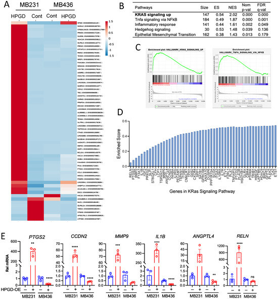 HPGD positively regulates gene expression associated with KRAS signaling in MB231 cells, whereas it exerts a negative regulatory effect on gene expression in MB436 cells. (A) Heat map of genes differentially expressed in MB231-HPGD and MB436-HPGD cells. (B) GSEA indicates functional pathways regulated by HPGD in MB231 cells. Adjusted q-values (FDR) are shown. (C) Enrichment scores (ES), normalized enrichment score (NES), normalized p-values, FDR q-values of KRAS signaling and TNF alpha signaling by HPGD in MB231 cells. (D) Genes listed with ES in the KRAS signaling pathway. (E) Relative mRNA expression levels of MB231-HPGD and MB436-HPGD cells by qRT-PCR. p-values by unpaired t-test. ** p < 0.01, *** p < 0.001, **** p < 0.0001.