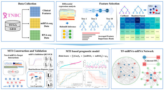 In this study, we developed a novel MTI-based prognostic model for TNBC in which eight important miRNAs are discovered by differential expression analysis, miRNA–mRNA regulatory correlations inference, and machine learning. By combining bioinformatics analysis with experimental validation, we identified 10 key MTI pairs as prognostic signatures, providing clinical insights for patient risk stratification. This approach uncovers hidden regulatory correlations of TNBC, improving prognostic accuracy and offering potential therapeutic insights. Furthermore, by analyzing feed-forward regulatory loops and network motifs, we provide a comprehensive TF–miRNA–mRNA regulatory landscape of TNBC, expanding our understanding of its regulatory mechanisms and guiding the development of more effective therapeutic strategies. The flowchart of this work is shown in Figure 1.