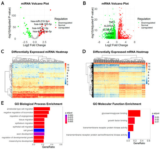 Identification of DEmiRs and DEGs. (A) Volcano plot of miRNA differential expression in TNBC samples; (B) volcano plot of mRNA differential expression in TNBC samples; (C) heatmap of miRNA differential expression between TNBC samples and normal samples; (D) heatmap of mRNA differential expression between TNBC samples and normal samples; (E) GO functional enrichment for differentially expressed mRNAs. Left: bar chart of top 10 GO biological processes analysis; right: bar chart of GO molecular functions analysis.