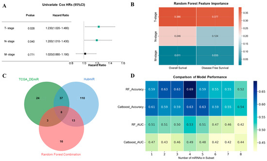 Identification of prognosis-related miRNAs in TNBC. (A) A univariate Cox regression analysis was performed to identify key clinical features that affected survival outcomes, the green squares represent significant clinical features, while the black square indicates non-significant features; (B) a random forest algorithm was performed to identify key clinical features associated with survival outcomes; (C) Venn plot showing TCGA-, HubmiR-, and random forest combination-selected miRNAs; (D) performance comparison of different miRNA subsets in terms of median accuracy and median AUC among two machine-learning algorithms.