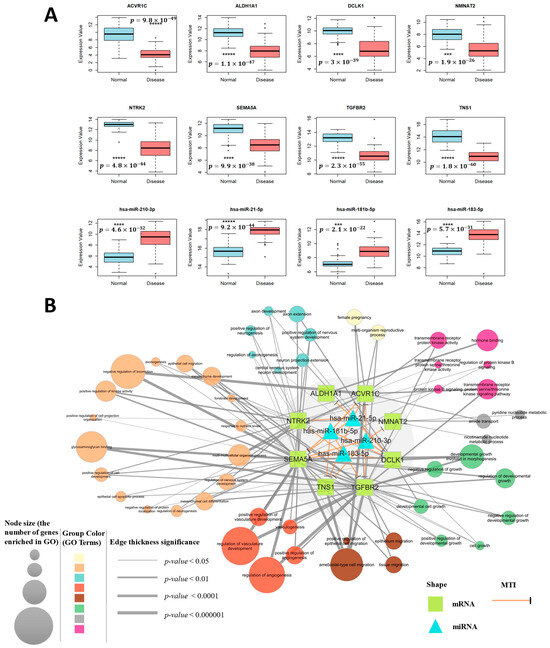 (A) Expression profile of selected miRNAs and mRNAs in TNBC data. The box plots show the expression values for normal versus disease samples. Statistical significance is indicated as follows: *** for p-value < 0.0001, **** for p-value < 0.00001, and ***** for p-value < 0.000001; (B) the miRNA–mRNA regulatory network in TNBC and a network diagram of individual target gene functions.