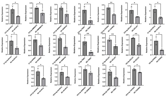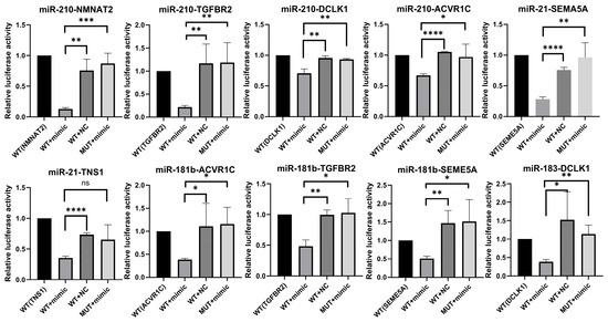 To validate the direct interactions between the selected miRNAs and their target mRNAs, we performed dual-luciferase reporter assays for 19 miRNA–target pairs. Eighteen of these pairs were confirmed, with miRNA mimics significantly inhibiting the expression of their target mRNAs (p-value < 0.05) (Supplementary Figure S2). Notably, ten MTIs—miR-210-3p/NMNAT2, miR-210-3p/TGFBR2, miR-210-3p/DCLK1, miR-210-3p/ACVR1C, miR-21-5p/TNS1, miR-21-5p/SEMA5A, miR-181b-5p/ACVR1C, miR-181b-5p/TGFBR2, miR-181b-5p/SEMA5A, and miR-183-5p/DCLK1—showed strong interactions between the miRNAs and their target mRNAs. For these pairs, co-transfection with miRNA mimics significantly reduced the luciferase activity of plasmids containing wild-type 3′ UTR fragments of the target genes. At the same time, no effect was observed with the mutated fragments (Figure 5). These results validate the computational predictions of interaction and mRNA binding sites.