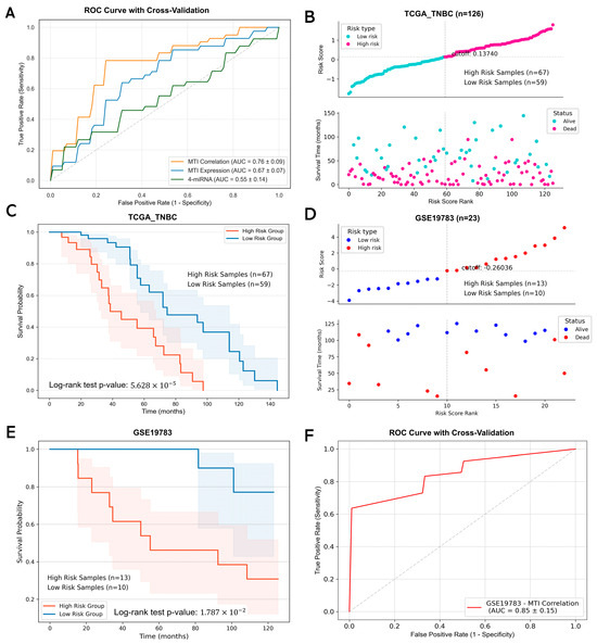 Performance evaluation and validation of the MTI-based prognostic model in TNBC. (A) ROC curves comparing the predictive performance of three approaches: 10 MTI correlations, 10 MTI associated gene expression, and 4-miRNA signatures; (B) distribution of risk score and overall survival status of the patients based on the risk score in TCGA cohorts. The vertical gray dashed line on the x-axis denotes the risk score cutoff value, and the horizontal gray dashed line on the y-axis indicates the corresponding rank value of the cutoff; (C) Kaplan–Meier survival curves for high- and low-risk groups in the TCGA_TNBC cohort; (D) distribution of risk score and overall survival status of the patients based on the risk score in GSE19783 cohorts. The vertical gray dashed line on the x-axis denotes the risk score cutoff value, and the horizontal gray dashed line on the y-axis indicates the corresponding rank value of the cutoff; (E) Kaplan–Meier survival curves for high- and low-risk groups in the GSE19783 validation cohort; (F) ROC curve of the 10 MTI correlation-based model in the GSE19783 dataset.